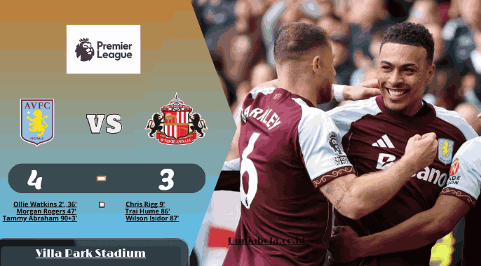 Aston Villa meraih kemenangan yang tidak akan cepat dilupakan para pendukungnya setelah menekuk Sunderland dengan skor 4 3 di Villa Park pada 19 April 2026. Laga ini sempat terlihat nyaman bagi tim asuhan Unai Emery, tetapi berubah liar pada menit menit akhir sebelum Tammy Abraham muncul sebagai penentu kemenangan pada masa tambahan waktu. Hasil tersebut membuat Villa terus menjaga tekanan di papan atas dan menempatkan mereka sejajar poin dengan Manchester United dalam perebutan posisi elite klasemen Liga Inggris.