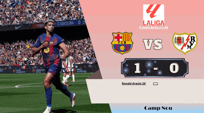 Barcelona kembali meraih tiga poin penting setelah menundukkan Rayo Vallecano dengan skor tipis 1 0 dalam lanjutan LaLiga pada 22 Maret 2026. Gol tunggal Ronald Araujo pada babak pertama menjadi pembeda dalam laga yang berlangsung ketat, tetapi cerita pertandingan ini tidak hanya berhenti pada papan skor. Barcelona sempat tampil dominan, lalu dipaksa bertahan mati matian ketika Rayo meningkatkan intensitas serangan pada paruh kedua. Gol Araujo lahir pada menit ke 24, sementara Joan Garcia tampil sangat menentukan di bawah mistar untuk menjaga keunggulan itu sampai peluit akhir berbunyi.