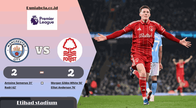 Etihad Stadium biasanya jadi panggung yang membuat lawan kehabisan napas. Tapi Rabu malam 4 Maret 2026, ada cerita yang berbeda. Manchester City menguasai bola, menumpuk peluang, bahkan sempat dua kali memimpin, namun Nottingham Forest menolak runtuh dan pulang membawa hasil 2-2 yang terasa seperti kemenangan kecil bagi tim papan bawah.