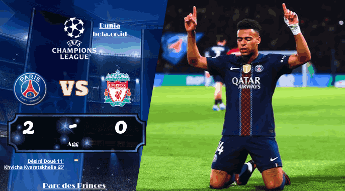 Paris Saint Germain memberi pukulan keras kepada Liverpool pada leg pertama perempat final Liga Champions 2025/26. Bermain di Parc des Princes pada 8 April 2026, tim asuhan Luis Enrique menang 2-0 lewat gol Désiré Doué dan Khvicha Kvaratskhelia. Hasil ini bukan sekadar kemenangan kandang biasa, karena dari empat tuan rumah di leg pertama fase 8 besar, hanya PSG yang mampu meraih kemenangan. Real Madrid kalah di kandang dari Bayern, Barcelona juga tumbang di kandang dari Atlético, sementara Sporting takluk di kandang dari Arsenal.