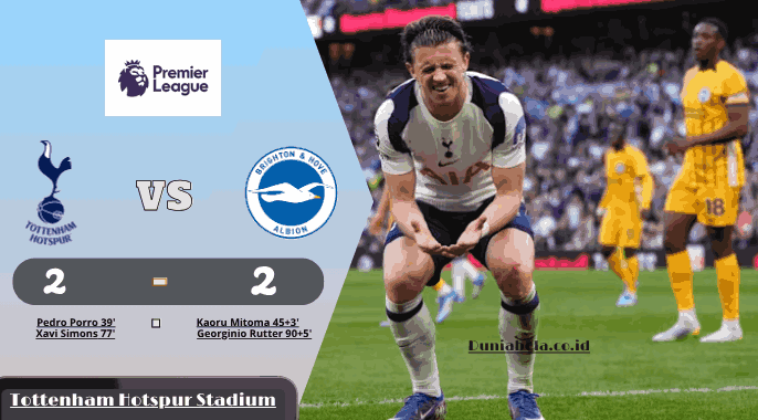 Tottenham Hotspur kembali gagal menjaga keunggulan saat menjamu Brighton and Hove Albion dalam lanjutan Premier League, Sabtu, 18 April 2026. Bermain di kandang sendiri, Spurs sempat dua kali unggul lewat Pedro Porro dan Xavi Simons, namun Brighton selalu menemukan jalan untuk bangkit. Gol Kaoru Mitoma menjelang turun minum dan penyelesaian Georginio Rutter pada masa tambahan waktu membuat laga berakhir 2 2. Hasil ini terasa pahit bagi Tottenham karena mereka sangat membutuhkan kemenangan untuk keluar dari tekanan di papan bawah.